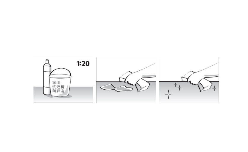 可以選用專用的中性地面清潔劑或家用洗潔精,地面清潔劑的稀釋比例可以按照不同產(chǎn)品的使用要求進行稀釋;如若是一般的家用洗潔精,可按照1:20的比例進行稀釋。